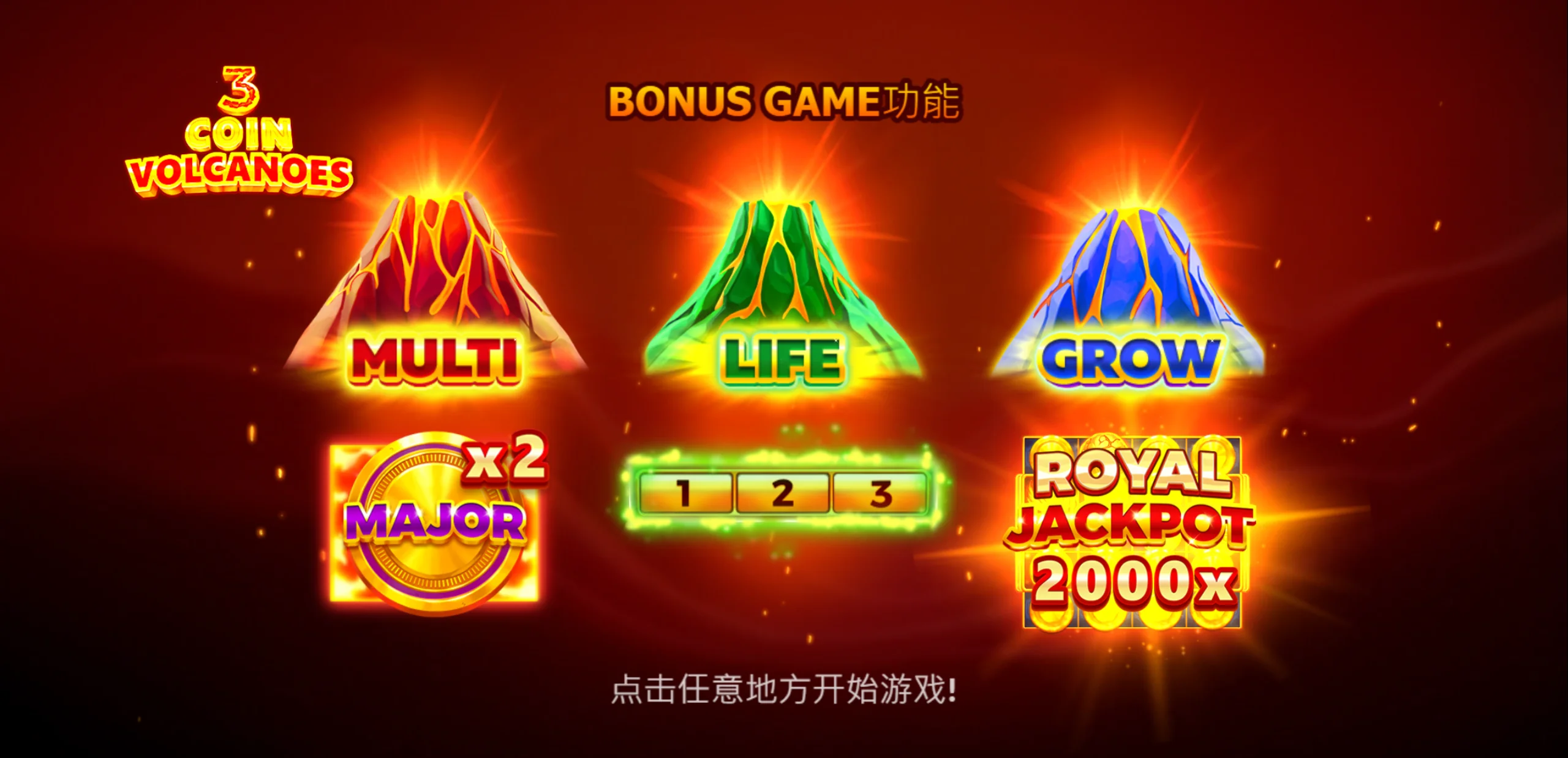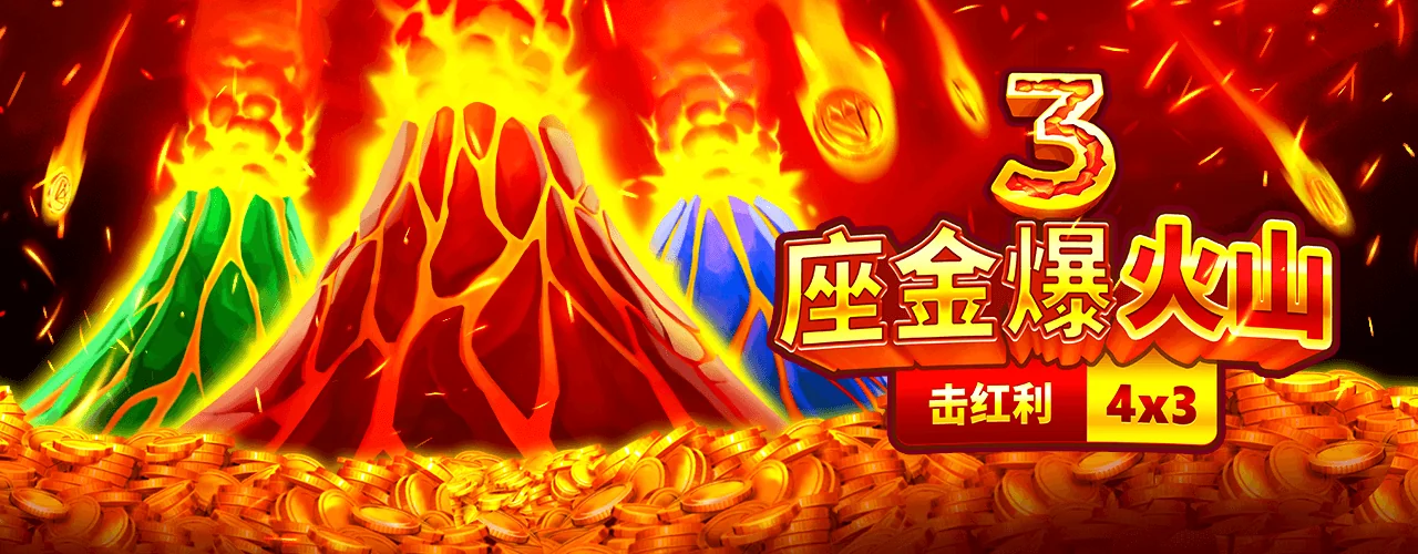 遊戲以 三座金色火山 為主視覺焦點,這些火山象徵財富的噴湧與爆發。火山不僅是畫面背景,更是整體玩法機制的核心。每當火山噴發,意味著可能出現高倍乘數、BONUS特效,甚至觸發免費遊戲,象徵一次財運來臨的絕佳時機。