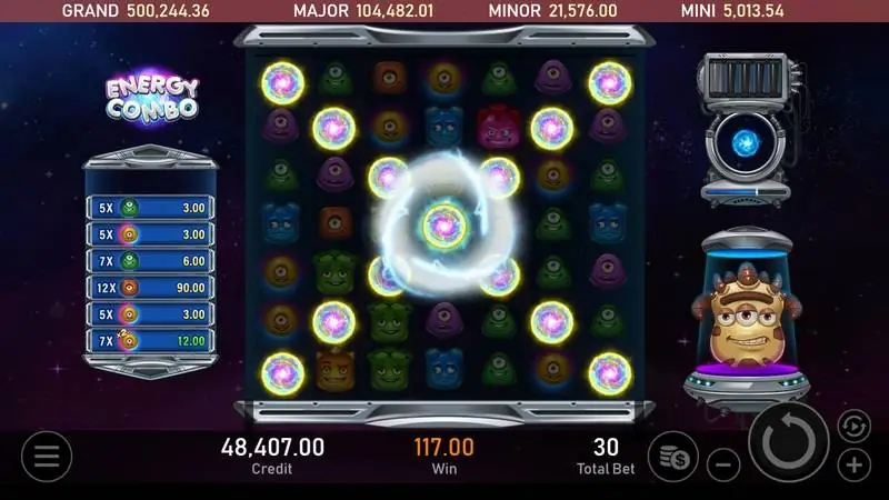 《能量外星人》以外星文明為核心主題,畫面設計充滿科幻感,包括漂浮星球、神秘能量體、異形符號等,讓玩家彷彿置身於銀河深處。每個符號都經過細緻繪製,色彩鮮明、動態流暢,融合3D動畫技術,視覺層次感十足。