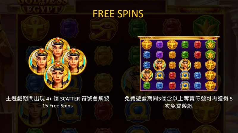 在《BNG電子埃及女神老虎機》中,免費旋轉功能是一個極具吸引力的特殊遊戲模式,能夠為玩家提供額外的獲勝機會和豐厚的回報。此功能通過觸發Scatter符號來啟動,並能顯著提高玩家的獲勝潛力。
