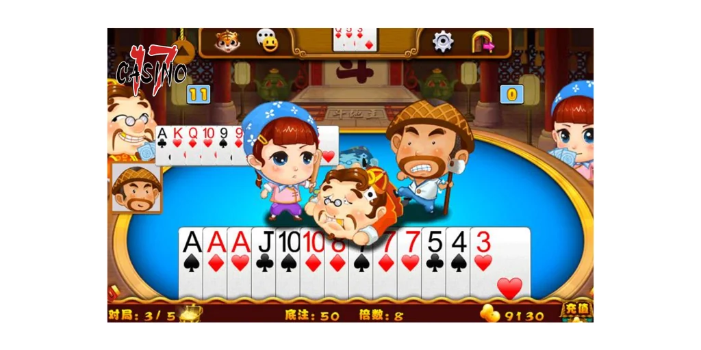 - 三人玩法最為常見,遊戲開始前隨機選擇一名玩家為地主,其餘兩位為農民。