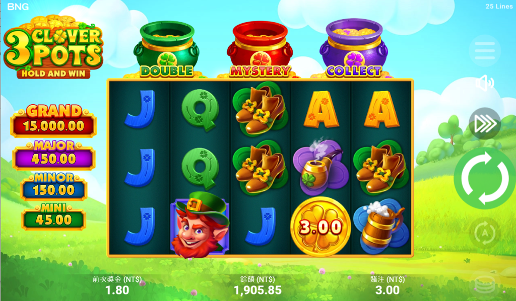 「3個三葉草罐-集鴻運」憑藉其獨特的遊戲設計和豐富的獎勵系統,成為BNG電子遊戲系列中的一顆閃亮明珠。遊戲不僅視覺效果出眾,音效也極具吸引力,讓玩家彷彿置身於一個魔幻的翡翠島嶼中。更令人驚喜的是,遊戲中設計了四種不同的JACKPOTS,包括MINI、MINOR、MAJOR和GRAND,這些JACKPOTS將根據玩家收集到的BONUS符號數量進行派發,讓每一位玩家都有機會贏得巨額獎金。